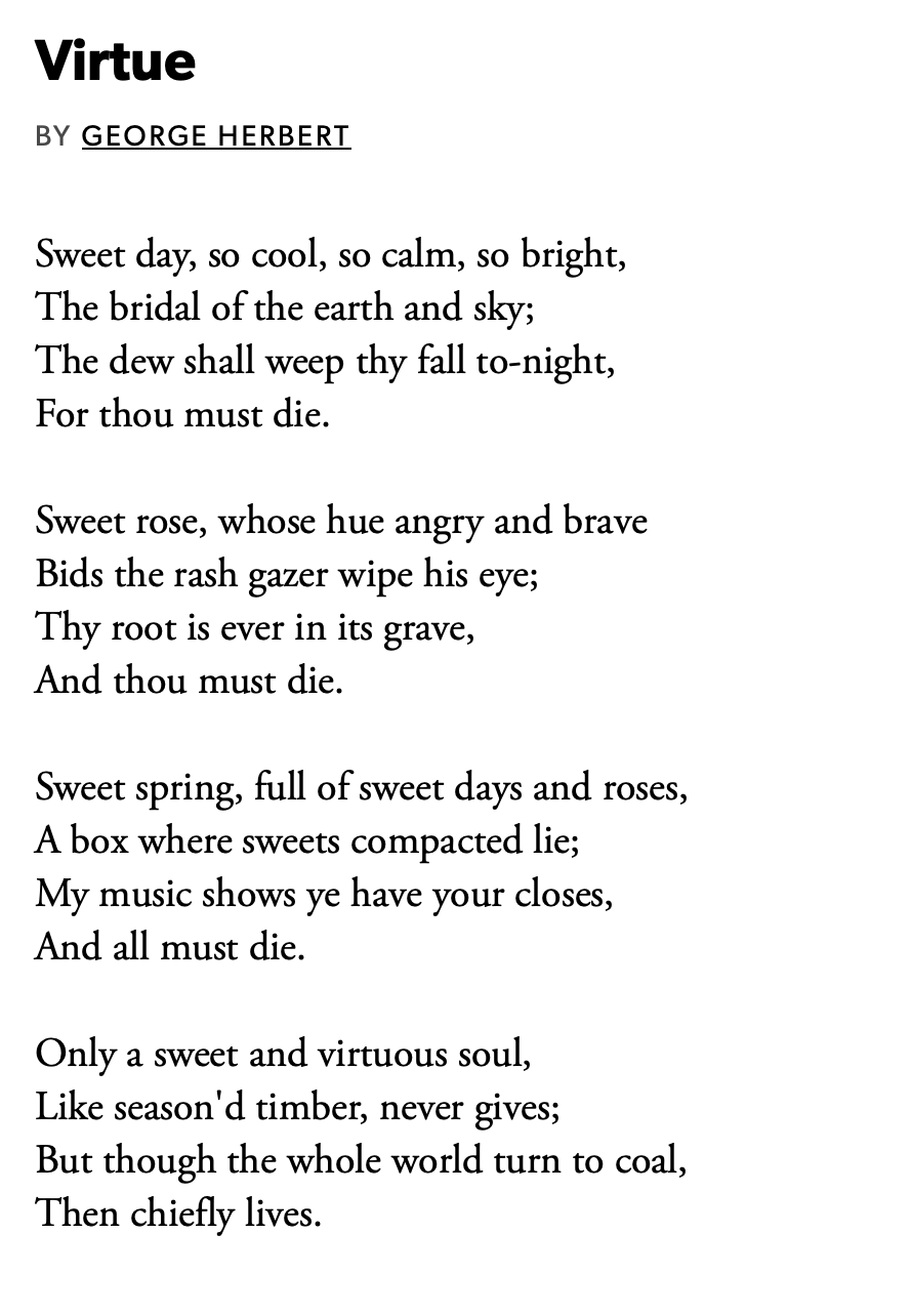 George Herbert : "Virtue"George Herbert was born today, April 3, in 1593. The FriendApr 03, 2023∙ Paid2ShareThis post is for paid subscribersSubscribeAlready a paid subscriber? Sign in