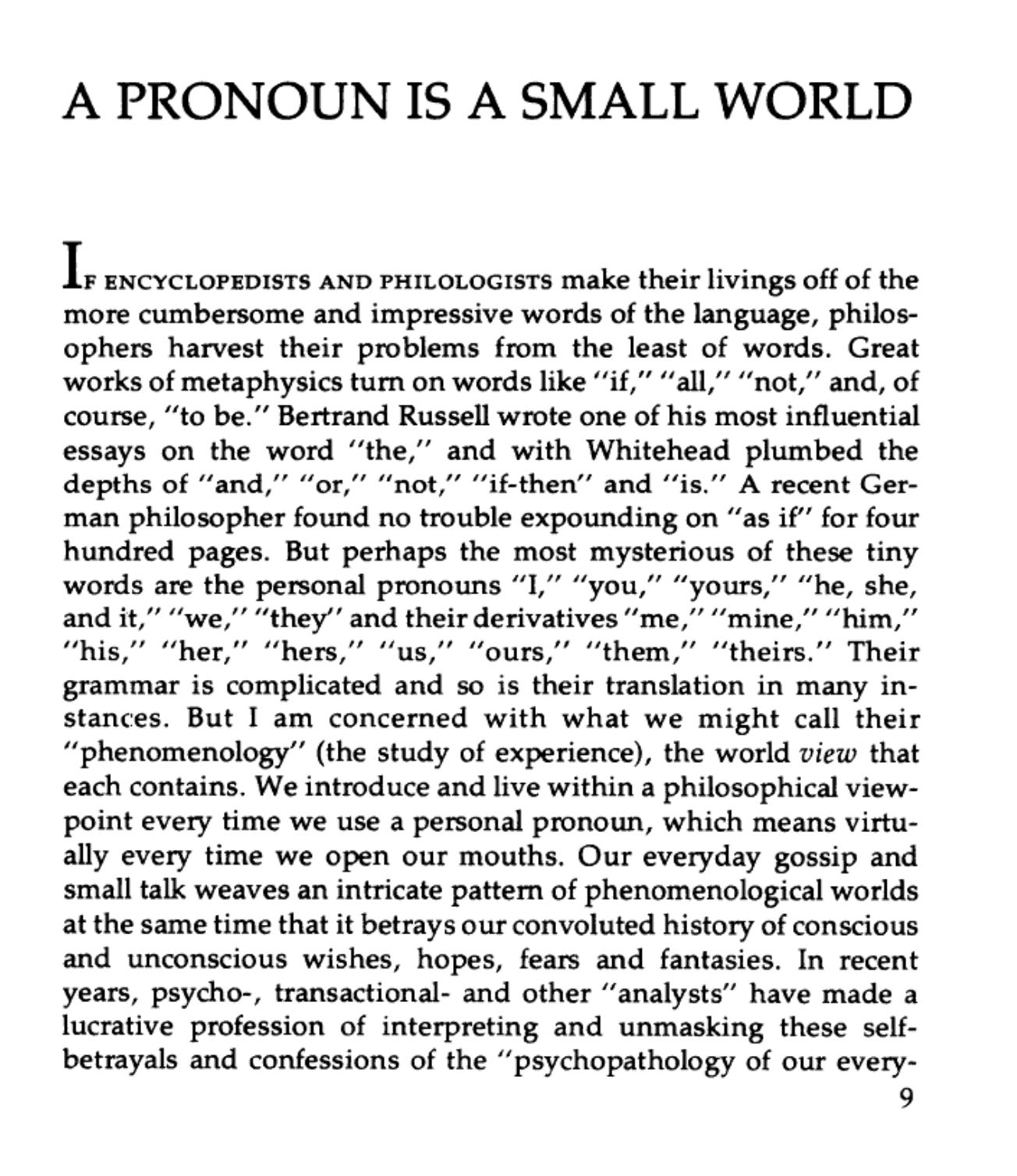 There’s a softly dense article on JSTOR I haven’t read yet but plan to. It’s by one Robert C. Solomon for the Chicago Review from the year of our lord, 1978. Their Spring issue. The title is simple and incredible: “A Pronoun is a Small World.”
